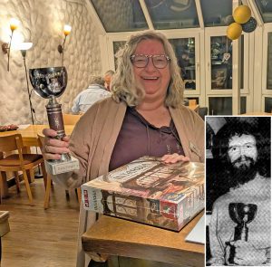 Zum Jubiläum war das Hotel mit Erinnerungen an vergangene Spieletreffs geschmückt. Quizmaster Roy hatte sich spezielle Fragen augedacht, die sich mit der Vergangenheit des Treffs beschäftigten. Und die Gewinnerin unserer beliebten Gästerätsel bekam diesmal neben einem Spiel auch einen historischen Pokal überreicht: Er wurde gestiftet von KMW, der ihn beim zweiten Spieletreff 1986 bei einem Spieleturnier gewonnen hatte.